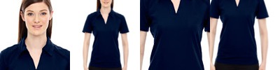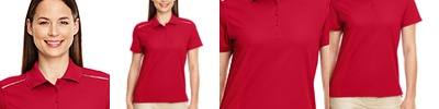 4.1 oz/yd² / 139 gsm, 100% polyester piqué with moisure-wicking, anti-microbial and UV protection performance; Matching flat-knit collar; Four-button narrow placket for feminine look; Side slits;