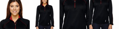 4.5 oz/yd2 / 160 gsm, 100% polyester mélange jersey; Moisture-wicking and antimicrobial performance; UV 15-39 protection; Center front translucent zipper; Contrast coverstitching; Reflective piping details;