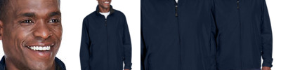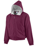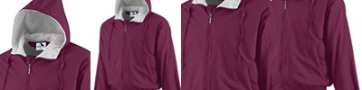 Outer shell of 100% nylon taffeta; Body,sleeves,hood: 75% polyester/13% rayon/12% cotton grey heather fleece; Water-resistant; Front zipper with inside storm flap; Hood with drawcord and sliders; Set-in sleeves for maximum mobility; Reinforced slash front pockets with zippers; Elastic cuffs and bottom; Woven label;