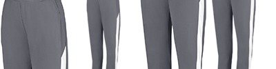 Heavyweight 100% polyester matte brushed tricot ; Heat-seal label; Covered elastic waistband with inside drawcord ; Side seam pockets ; Back yoke ; Contrast color side inserts ; Zipper on outside lower leg ; Matching top style 4387;