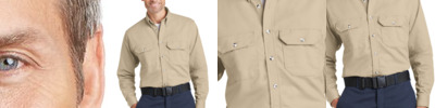 5.4 oz. 80/20 cotton/polyester blend; 2 chest pockets with button flaps; Hem bottom; Button cuffs; Roll up sleeves; Modern Fit;