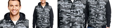 8.5 oz. 100% poly shell; 100% poly fleece insert sleeves; Snap front, 2 slash pockets; Rib bottom and cuffs; camo interior lining; Black camo has no stripe rib cuffs;