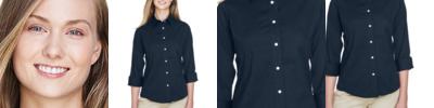 3.4 oz., 55% cotton, 45% polyester; Fine yarn count shirting; True Non-iron performance straight from the dryer; stain release finish; Active Fit; Patented pucker-free taped seams; Fused collar, cuffs, and placket; Split back seam with bias cut back yoke; straight collar; pearlized buttons; front and back princess seams for a flattering feminine fit; bust darts for a flattering feminine fit;
