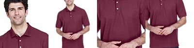 6.3 oz./yd2 / 215 gsm, 100% combed cotton pique with EZ Cool wicking technology; no-pill, no-fade, no-shrink, no-curl collar, no-wrinkle performance; Active fit; Matching flat-knit collar; Three-button placket;