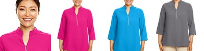 7.7 oz./yd² / 260 gsm, 100% cotton interlock with EZ Cool wicking technology; DRYTEC20™ technology offers no-pill, no-fade, no-shrink, no-curl collar, no-wrinkle performance; Active fit; Self fabric inside placket with chin guard; Inner collar in contrast self fabric; Center front coil zipper with autolock slider and faux leather pull; Princess seams for flattering feminine fit;