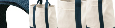 - contrast canvas bottom Exterior pocket Web handles Dimensions: 14.5"h x 14"w x 5.5"dNote: Bags not intended for use by children 12 and under. Includes a California Prop 65 and social responsibility hangtag.