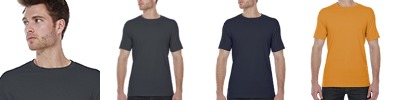 3.5 oz., 100% combed ring spun cotton, 40 singles; Heather Grey: 4.3 oz., 90% cotton 10% polyester, 30 singles; Side seams; Classic fit; Tear-away label; Made in a w.r.a.p. certified factory;
