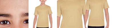 3.8 oz./yd / 130 gsm, 100% polyester interlock with moisture-wicking and UV protection performance; Athletic fit; Heat-sealed label; Cationic dyes to ensure superior brightness and excellent color fastness;