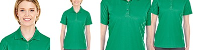 4.8 oz., 100% micro-textured polyester knit; Anti-bacterial; Moisture-wicking; Feminine fit; Flat-knit collar; 3-button placket; Hemmed sleeves; Matching shoulder panels; Side vents; Tagless;