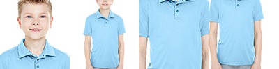 4 oz., 100% polyester; Moisture-wicking performance; UV 15-39 protection; self-fabric collar; tear-away label;